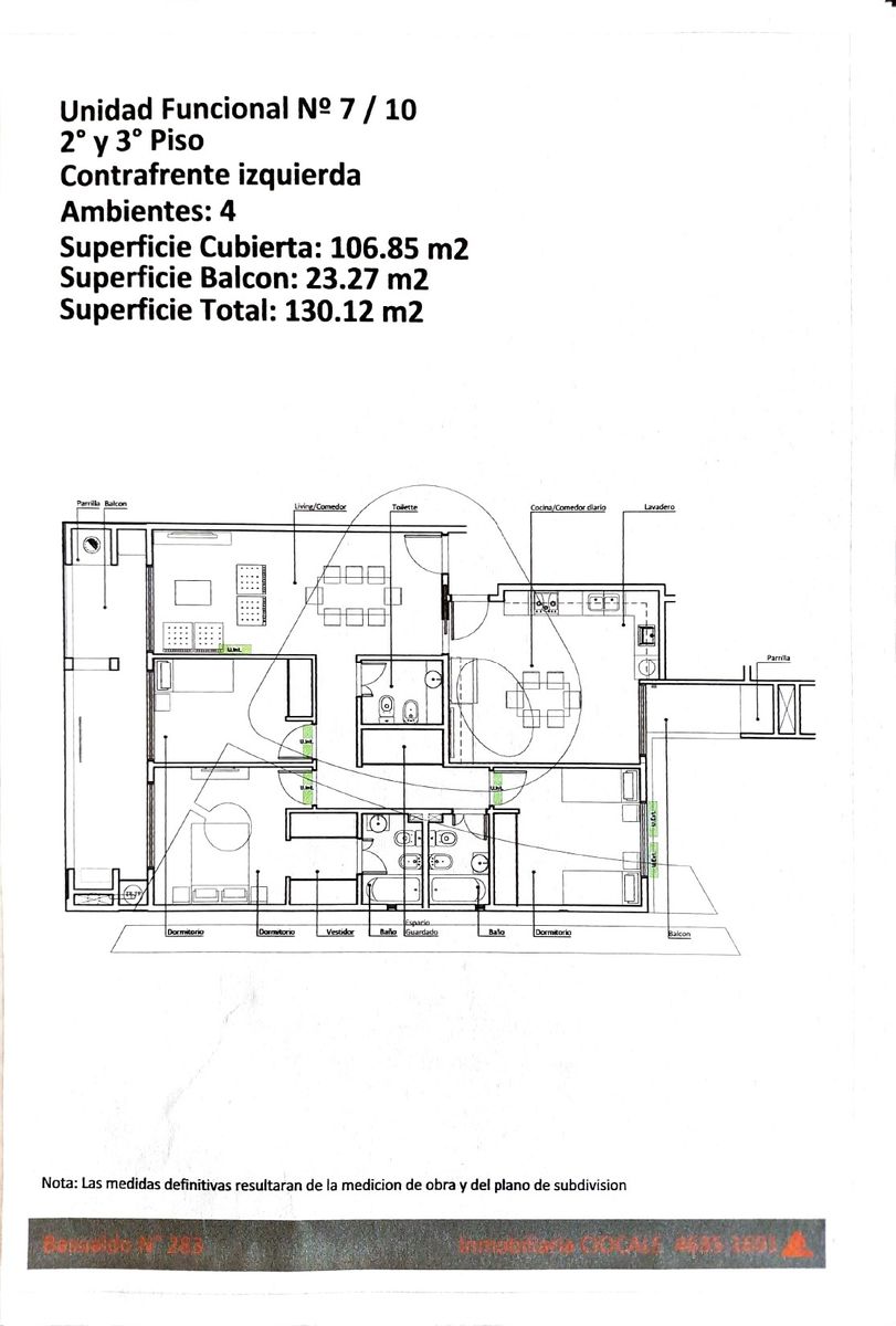 4 AMBIENTES AL FRENTE , 130 M2 TOTALES , 107 M2 CUB APROX , AMPLIO BALCON AL FRENTE , CON PARRILLA COCINA INDEPENDIENTE CON COMEDOR DIARIO Y SALIDA A SEGUNDO BALCON , DOS BAÑOS COMPLETOS ( UNO EN SUITE ) Y UN TOILETTE , DOBLE ENTRADA A LA UNIDAD POR LIVING COMEDOR Y POR COCINA , TRES HABITACIONES CON PLACARD E INTERIORES , BAÑOS COMPLETOS Y PLACARD EXTRA DE GUARDADO EN PASILLO . COCHERAS DISPONIBLES Nota importante/relevante: Toda la información y las medidas proveídas son sólo estimativas y deberán corroborarse con la documentación oportuna y no compromete contractualmente a nuestra compañía. Los gastos indicados (expensas, ABL) se refieren a la última información obtenida y deberán ratificarse. Las imágenes publicadas son meramente ilustrativas, no vinculantes y no contractuales.